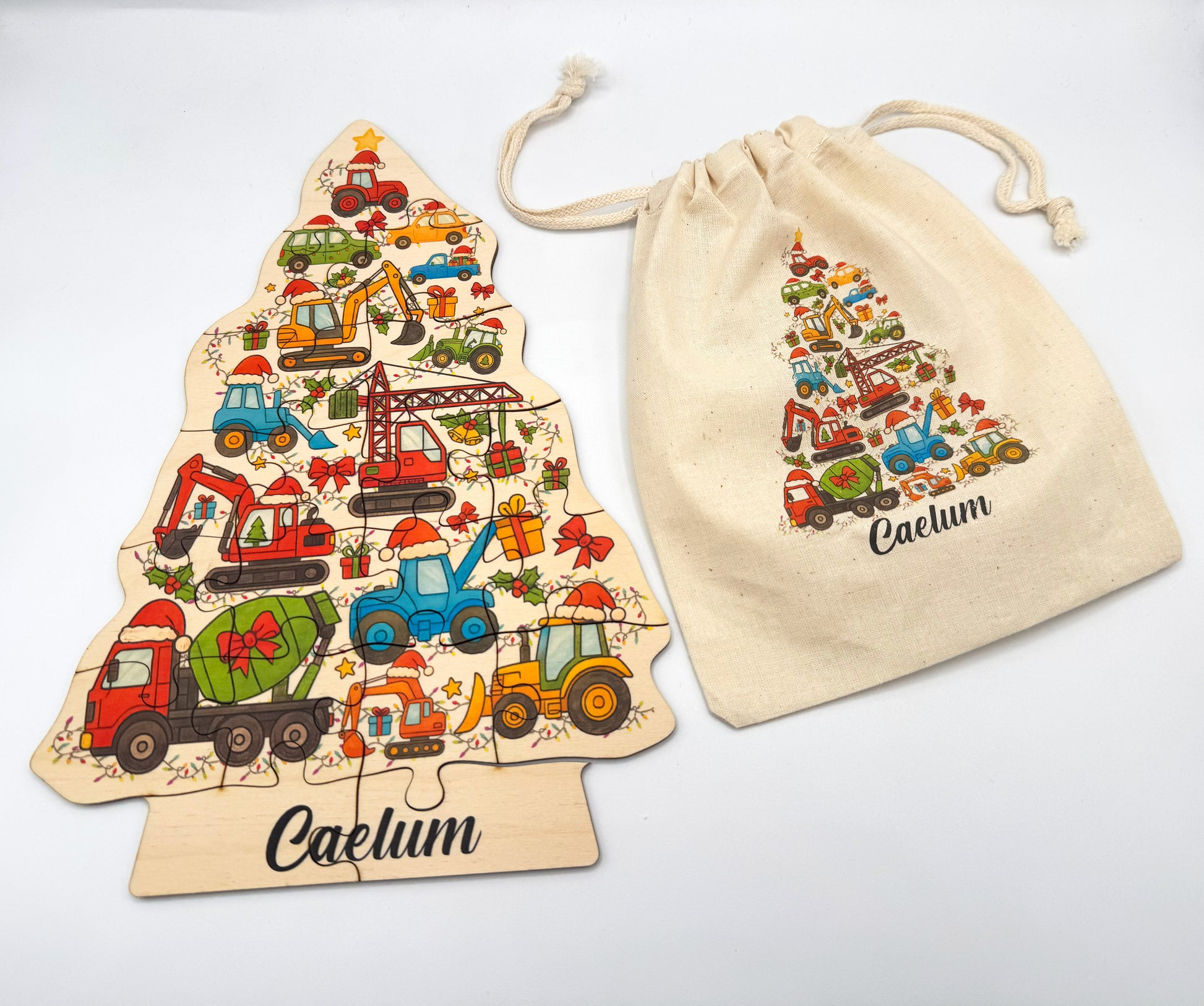 This adorable puzzle features a festive construction truck carrying a Christmas tree โ and can be customized with your childโs name for a truly unique holiday gift.